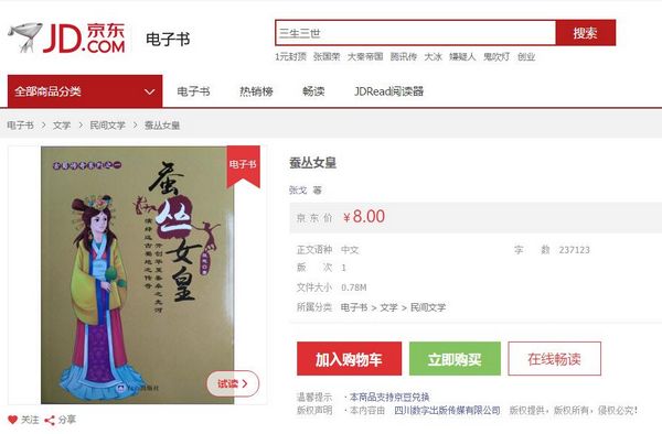 (京东图书购物平台出售页面) 中国文化观察网讯(龙建儒) 近日,熊猫文学创作第一人张戈著作的神话小说《蚕丛女皇》被四川新华文轩集团出版成电子书,同步在中国移动、...