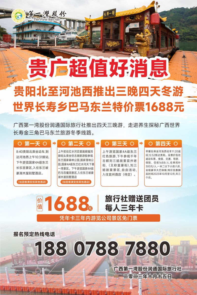 贵广超值好消息 贵阳北至河池西推出三晚四天冬游世界长寿乡巴马东兰特价票1688元