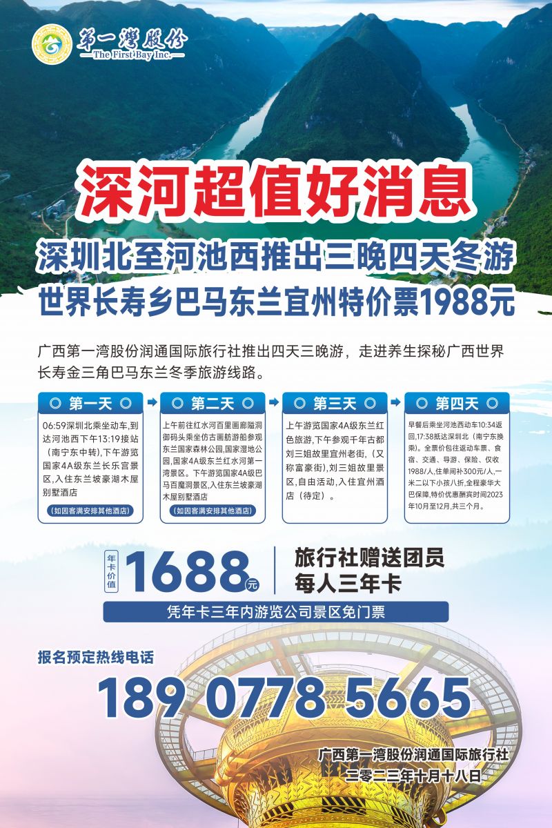 深河超值好消息 深圳北至河池西推出三晚四天冬游世界长寿乡巴马东兰宜州特价票1988元