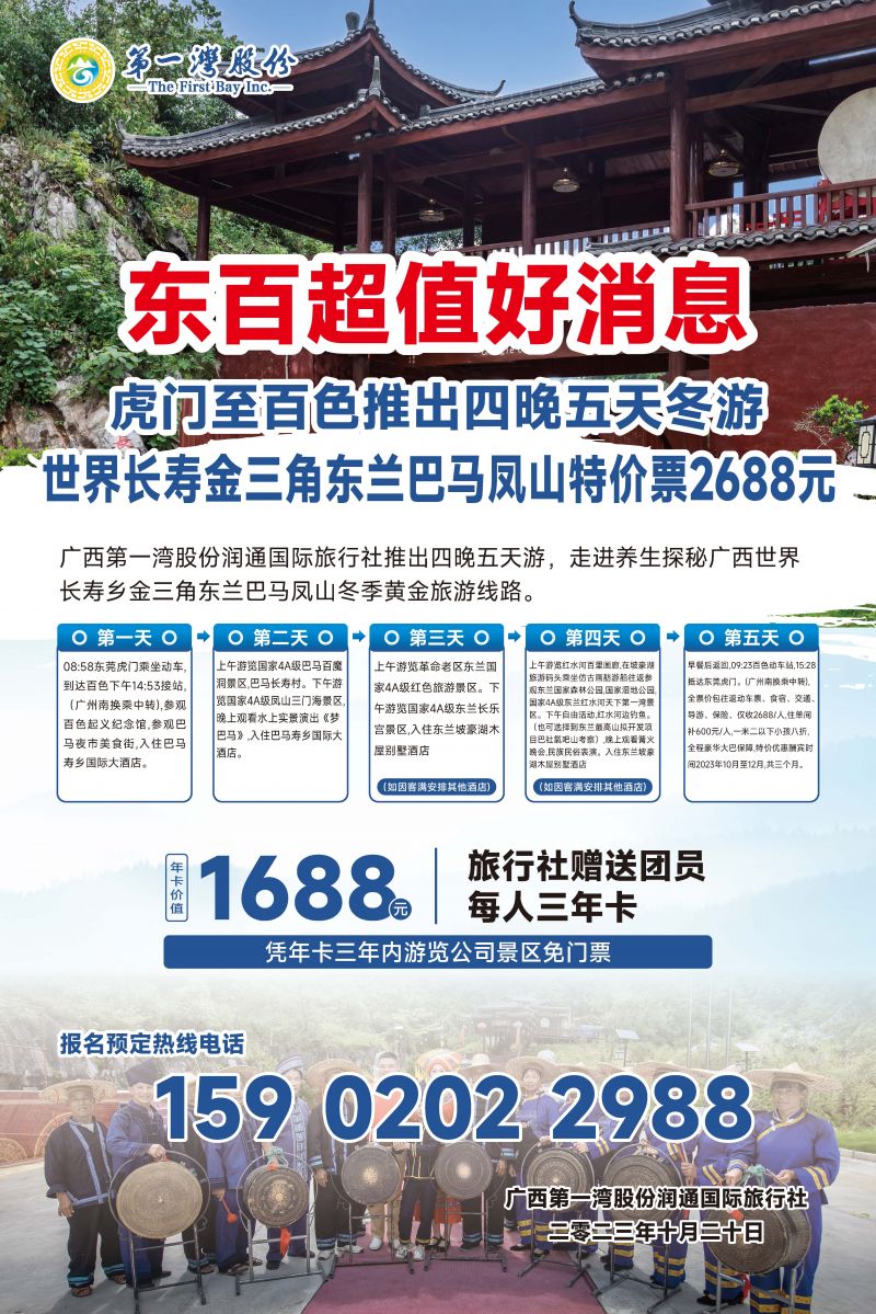 虎门至百色推出四晚五天冬游世界长寿金三角东兰巴马凤山特价票2688元 广西第一湾股份润通国际旅行社推出四晚五天游,走进养生探秘广西世界长寿乡金三角东兰...