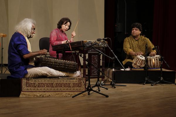 5月25日晚,第十五届北京现代音乐节中印文化交流专场音乐会《拉格茉莉》在中央音乐学院音乐厅成功上演。 (两位印度演奏家与中国扬琴演奏家刘月宁共同演绎作品《拉格茉...